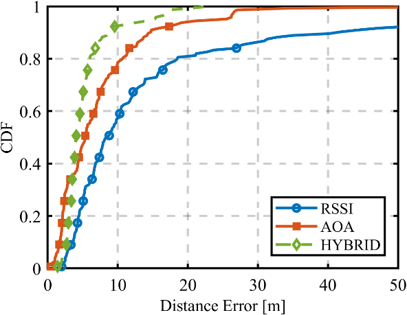 Fig.16 CDF of distance error comparing RSSI, AOA, and hybrid localization methods.